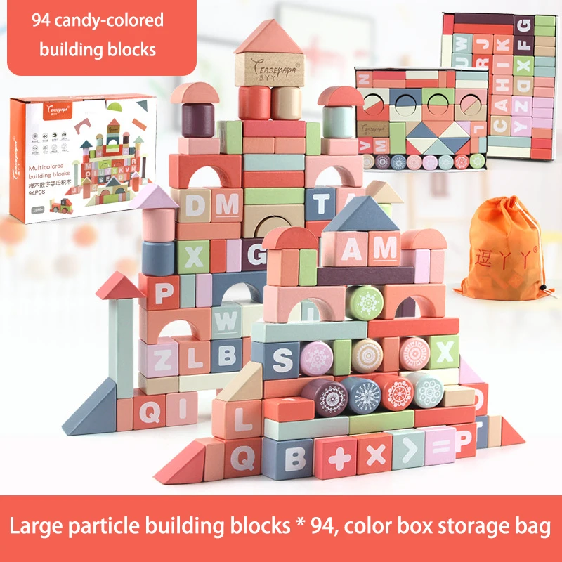 HIGH QUALITY 94 PCS children's wooden puzzle large solid wood colored wooden building block toy baby gift with g